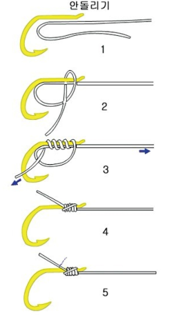 이상 낚시바늘 묶는 방법 5가지에 대해 안 돌리기 매듭법을 포함하여 알아보았다. 끝.