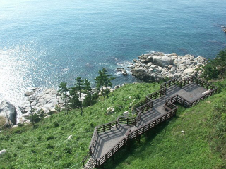 영덕 가볼만한곳 베스트 10 여섯 번째! 영덕 해맞이 공원은 1997년 대형 산불로 인해 송두리째 타버린 나머지 폐허가 되어버렸던 동해안 일대를 4년 동안 재건하여 만든 인공공원이다. 경치 조망과 사진 촬영이 가능한 전망데크를 비롯하여 향토 수종과 야생화가 가득한 자연학습장 그리고 산불 피해로 인해 타버린 목재를 이용을 한 침목계단 등이 자리하고 있다.
