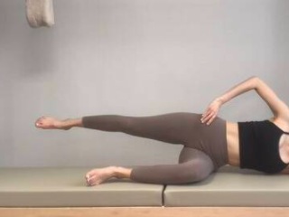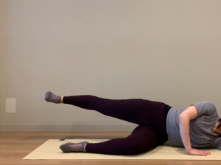 매트 위 바른 정렬로 옆으로 누워서 아래 다리를 90도로 구부리고, 윗 다리를 옆으로 뻗어준다. 아래에 있는 옆구리를 살짝 띄워서 유지하고, 골반이 기울어지거나 흔들리지 않도록 잡아준 뒤 위에 다리를 골반 높이까지 올려준다. 내쉬고, 마시는 호흡을 반복하며 발끝으로 작은 원을 오른쪽으로 10회, 왼쪽으로 10회 그려준다.