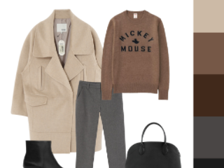 톤온톤 코디라는 말이 어렵다면 일명 깔맞춤을 떠올리면 쉽다. 비슷한 톤으로 색을 맞추기 때문에 어렵지 않고 무난한 듯 센스 있어 보이는 효과를 줄 수 있다. 베이지 컬러와 브라운 컬러, 진한 그레이와 연한 그레이 등이 대표적인 톤온톤 코디 사례다. 부드러운 이미지의 웜톤에게 잘 어울리는 조합이기도 하다.