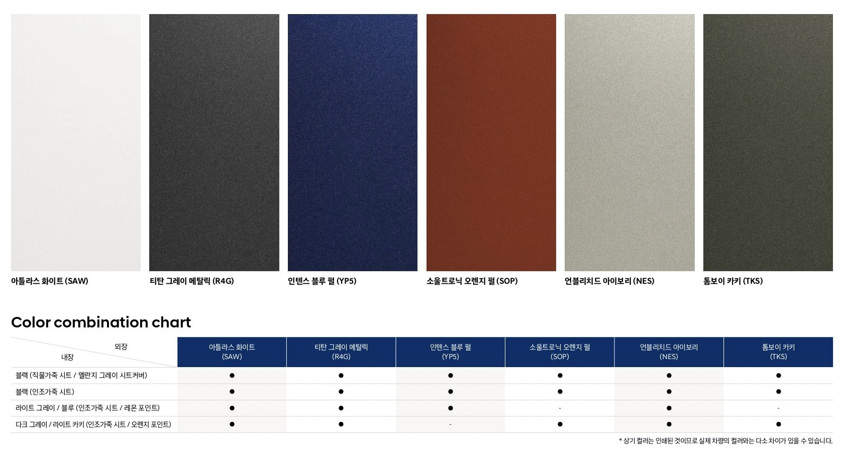 아틀라스 화이트(SAW), 티탄 그레이 메탈릭(R4G), 인텐스 블루 펄(YP5), 소울트로닉 오렌지 펄(SOP), 언블리치드 아이보리(NES), 톰보이 카키(TKS)