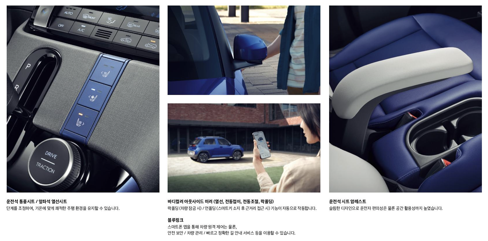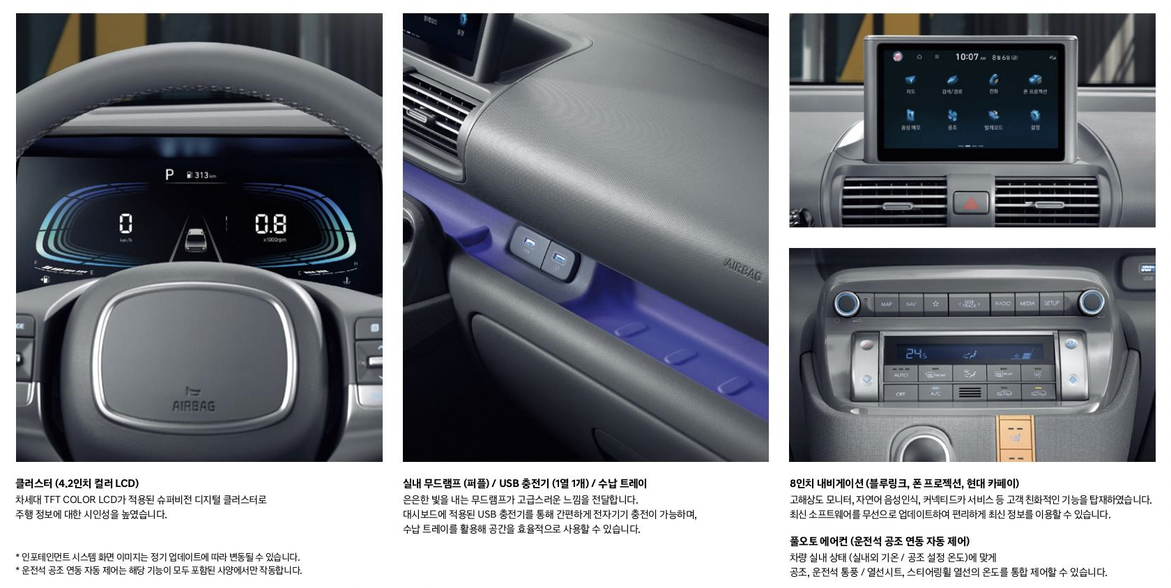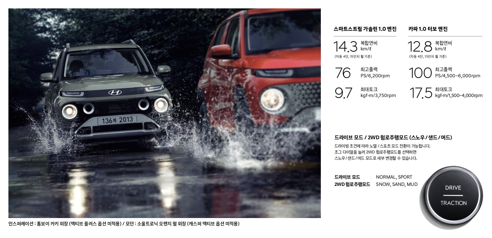 · 파워트레인: 스마트스트림 가솔린 1.0 엔진, 4단 자동변속기, 풋파킹 브레이크
