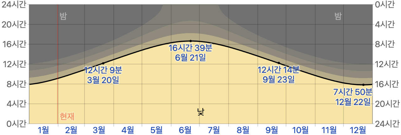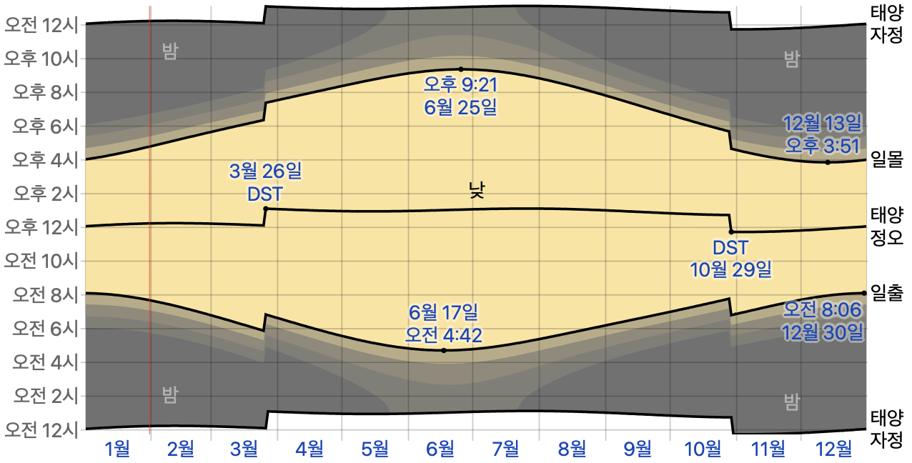 해가 가장 빨리 뜨는 날은 6월 17일 오전 4시 42분이며, 해가 가장 늦게 뜨는 날은 12월 30일 오전 8시 6분이다. 해가 가장 일찍 지는 날은 12월 13일 오후 3시 51분이며, 가장 늦게 지는 날은 6월 25일 오후 9시 21분이다.