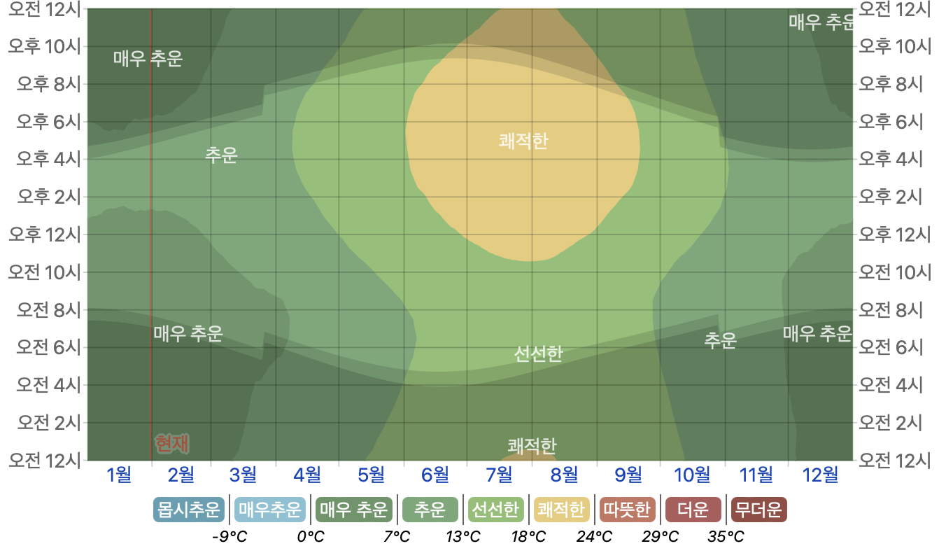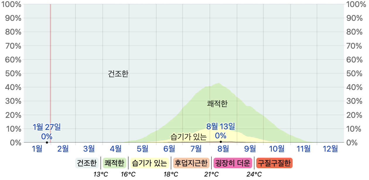 런던의 습도 레벨 중 후덥지근하거나 굉장히 덥거나 구질구질한 상태는 일 년 중 변화의 폭이 크지 않으며 일 년 내내 거의 0%이다.