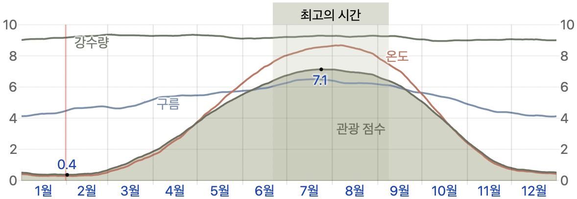 야외 관광 활동을 위하여 런던를 방문하는데 1년 중 최선의 시간은 6월 말에서 9월 초까지이며, 최고의 점수는 7월의 마지막 주다.