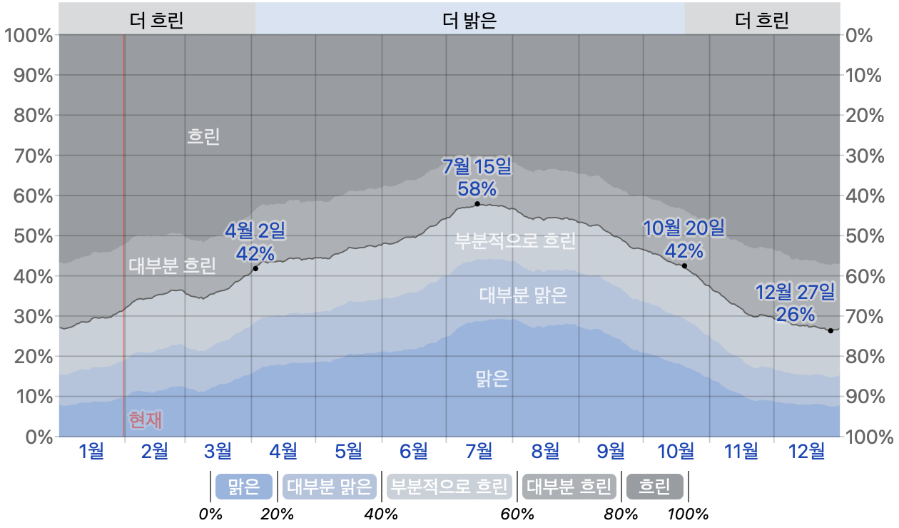 런던에서는 일 년 동안 구름이 하늘을 가리는 평균 퍼센트가 계절을 통하여 심한 변화가 있다. 런던에서 1년 중 밝은 부분은 4월 2일경에 시작하며 6.5개월 간 지속되고 10월 20일경에 끝난다.