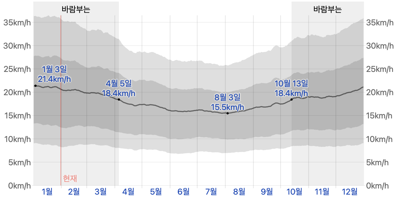 런던의 평균 시간당 풍속은 일 년 동안 상당한 변화가 있다. 1년 중 바람이 더 부는 때는 10월 13일부터 4월 5일까지 5.8개월 동안 지속되며, 평균 풍속은 시속 18.4킬로미터 이상이다. 런던에서 일 년 중 바람이 가장 많이 부는 달은 1월이며, 평균 시간당 풍속은 시속 21.1킬로미터이다.