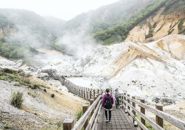 17시에 노보리베츠 지고쿠다니를 30분 동안 견학. 지고쿠다니(지옥의 계곡)는 넓은 폭열화구군이다. 부글부글 끓는 온천이 마치 지옥을 연상케 한다는 데에서 유래한 이름이다.