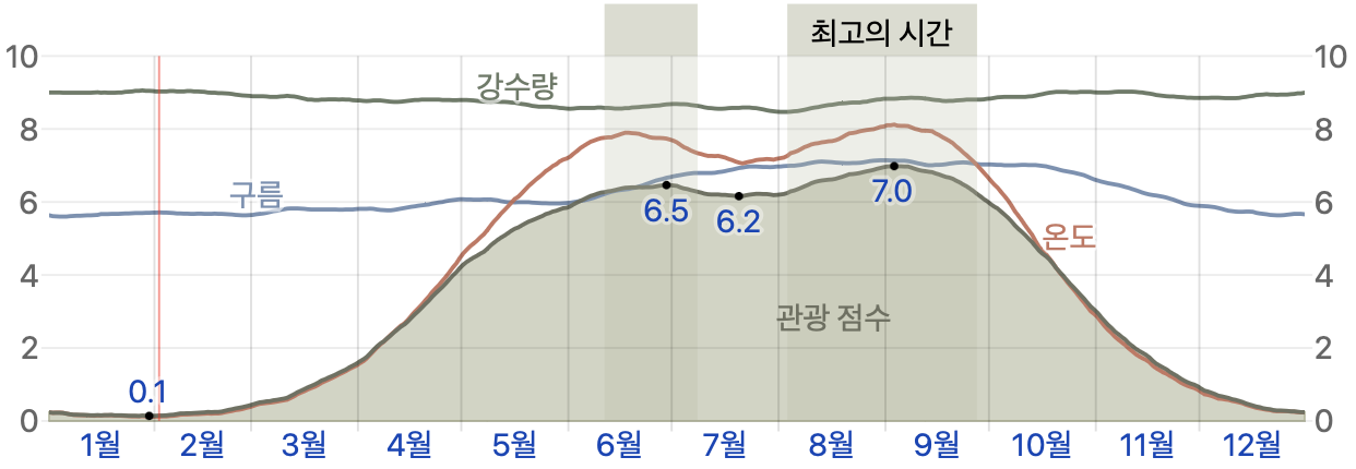 야외 관광 활동을 위하여 뉴욕를 방문하는데 1년 중 최선의 시간은 6월 중순부터 7월 초까지, 그리고 8월 초부터 9월 말까지이며, 최고의 점수는 9월의 첫 번째 주이다.