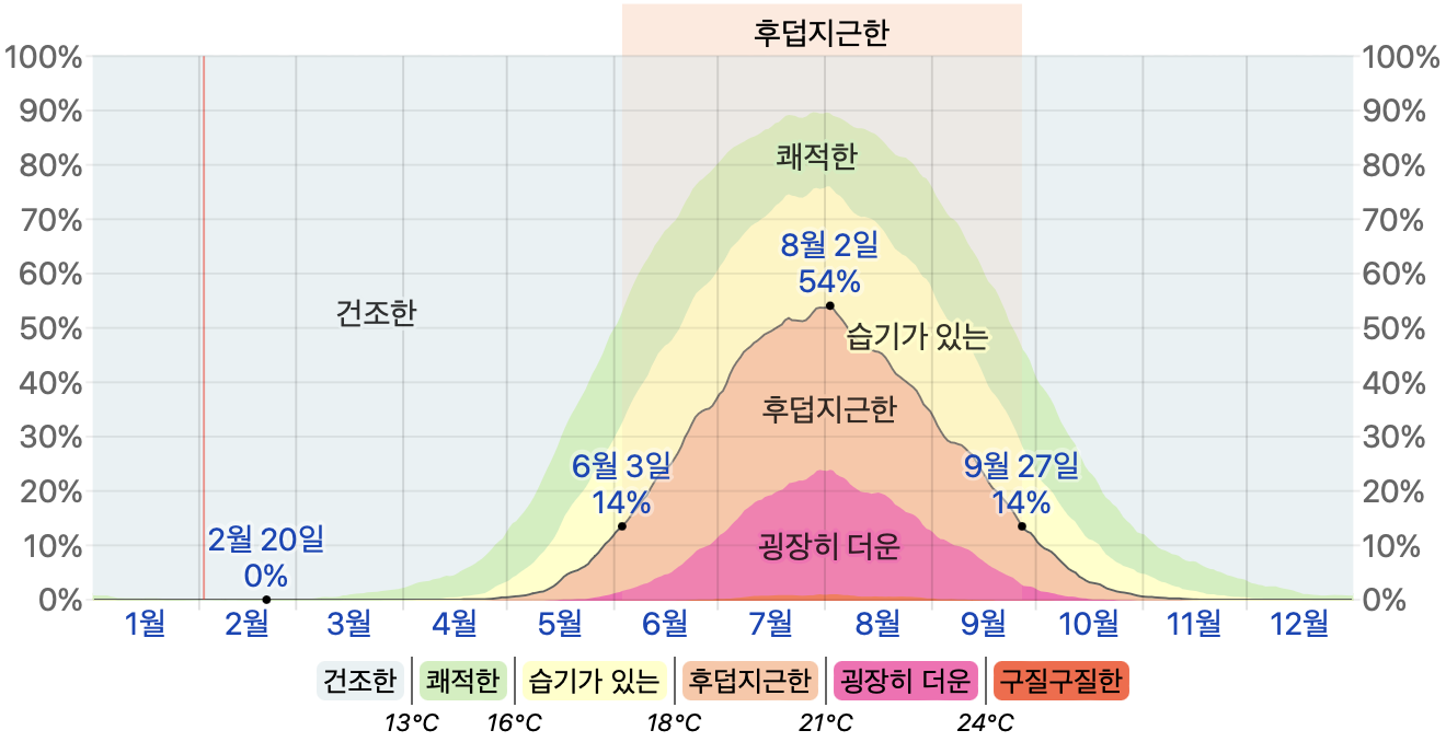 뉴욕에서 1년 중 후덥지근한 날이 가장 많은 달은 7월이며, 후덥지근하거나 더 나쁜 날은 15.1일이다. 1년 중 가장 덜 후덥지근한 날은 2월 20일이며, 후덥지근한 때가 전혀 없다.
