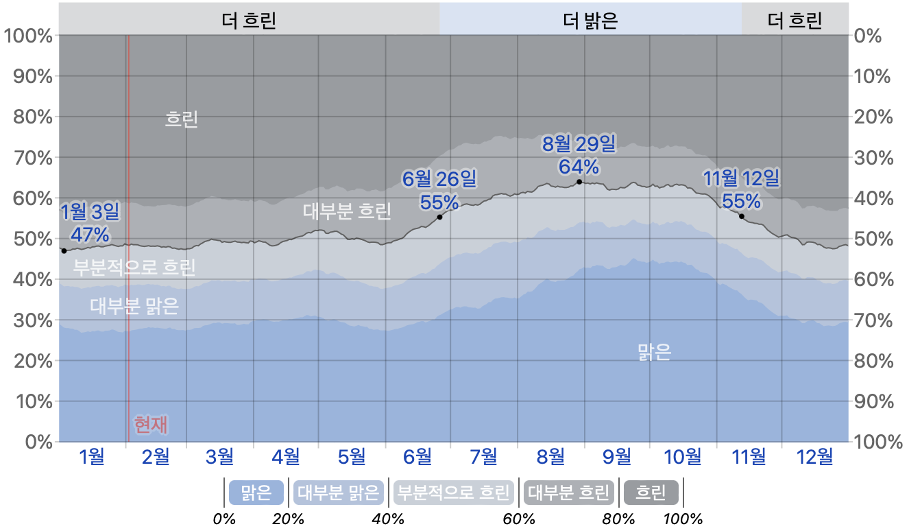 뉴욕에서는 일년 동안 구름이 하늘을 가리는 평균 퍼센트가 계절을 통하여 가벼운 변화가 있다. 뉴욕에서 1년 중 밝은 부분은 6월 26일경에 시작하며 4.6개월 동안 지속되고 11월 12일경에 끝난다.