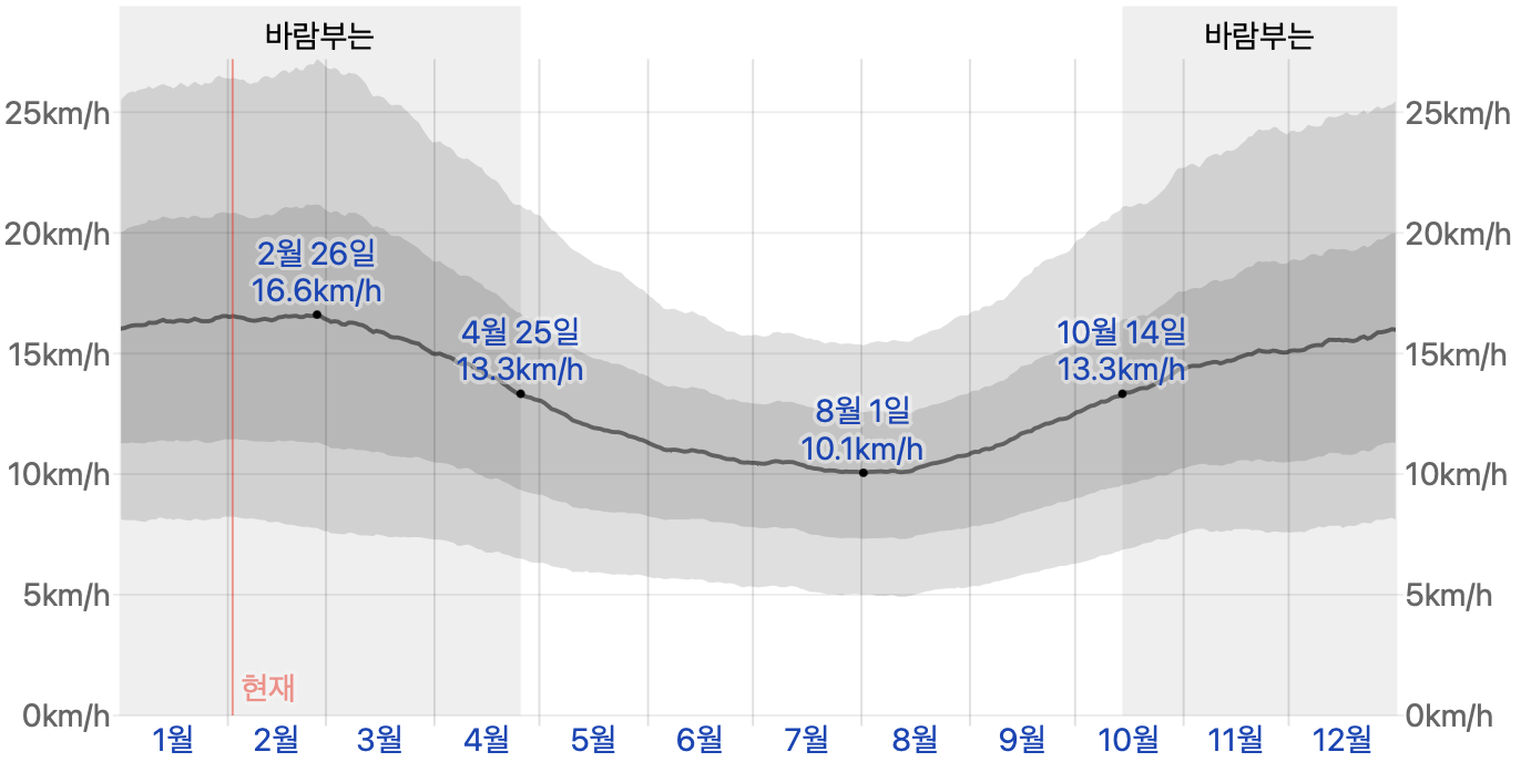 1년 중 바람이 적게 부는 때는 4월 25일부터 10월 14일까지 5.6개월 동안 지속된다. 뉴욕에서 1년 중 가장 고요한 달은 7월이며 평균 시간당 풍속은 시속 10.3킬로미터이다.