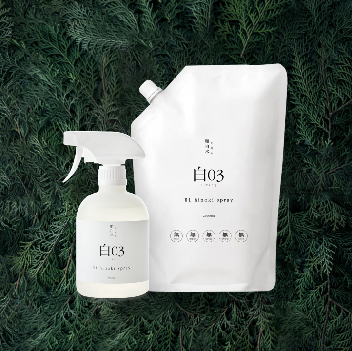 순백수 편백 스프레이는 피톤치드가 가득한 편백 오일로 만든 섬유탈취제다. 대장균, 황색포도상구균, 살모넬라균, 녹농균 등을 98% 이상 살균할 수 있는 살균력을 갖추고 있으며, 악취의 원인이 되는 황화수소, 암모니아, 트리메틸아민, 그리고 포름알데히드도 없앨 수 있다. 침엽수림 중에서도 피톤치드 발산량이 가장 높은 편백나무로 만들었다. 500㎖ 단품의 판매가는 18,900원이다.